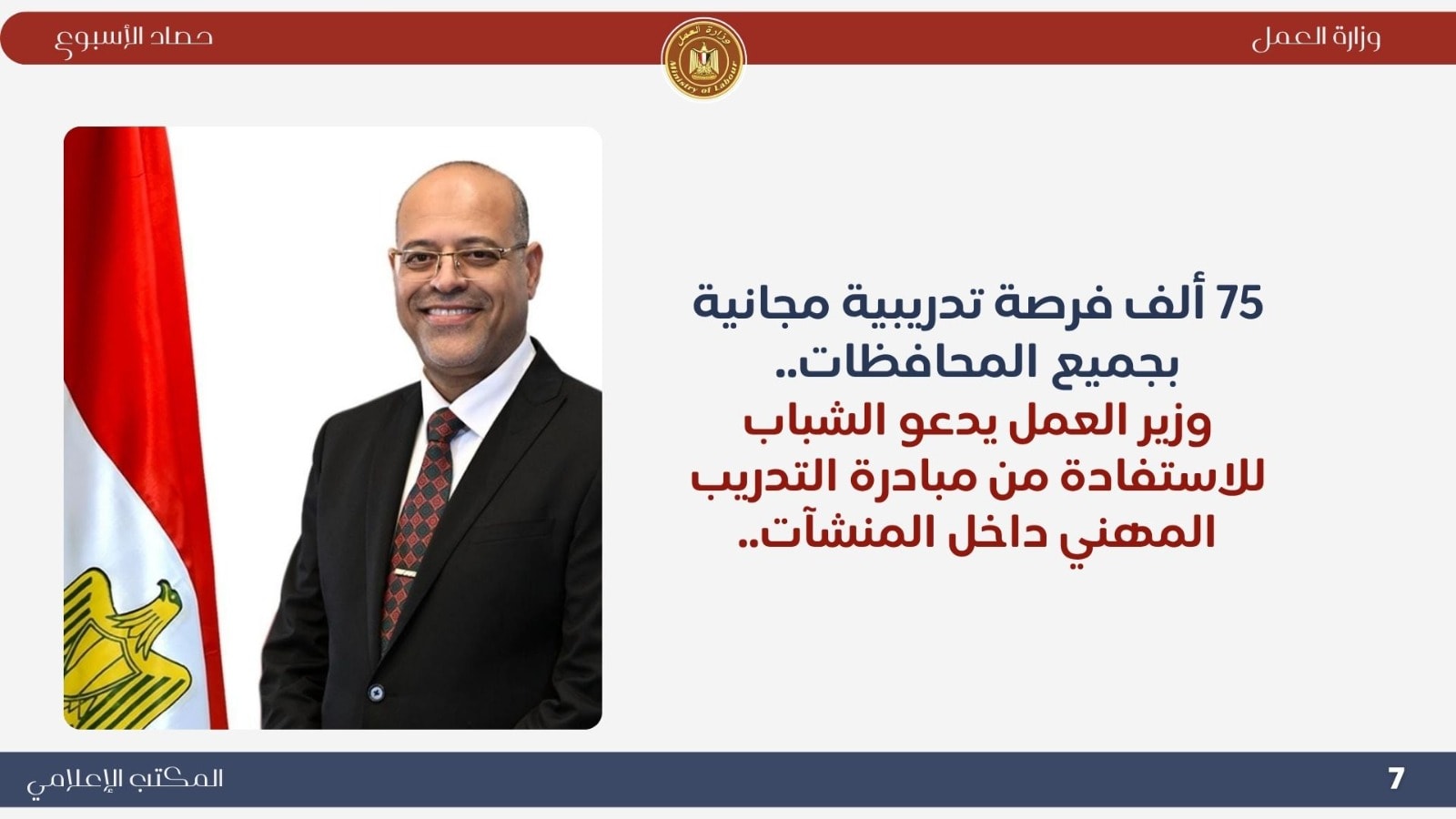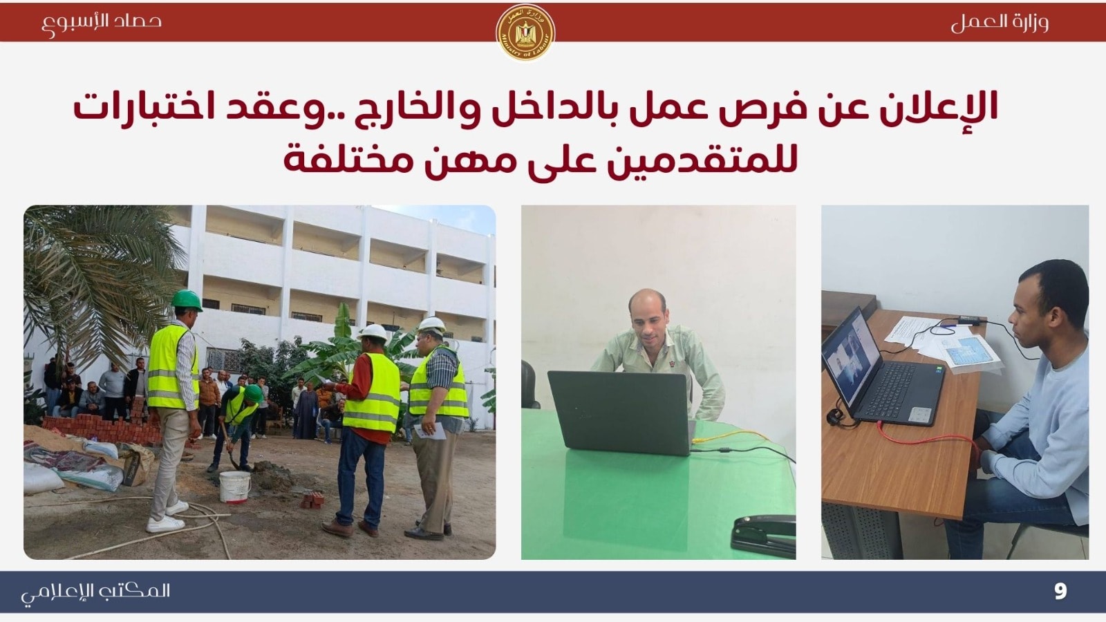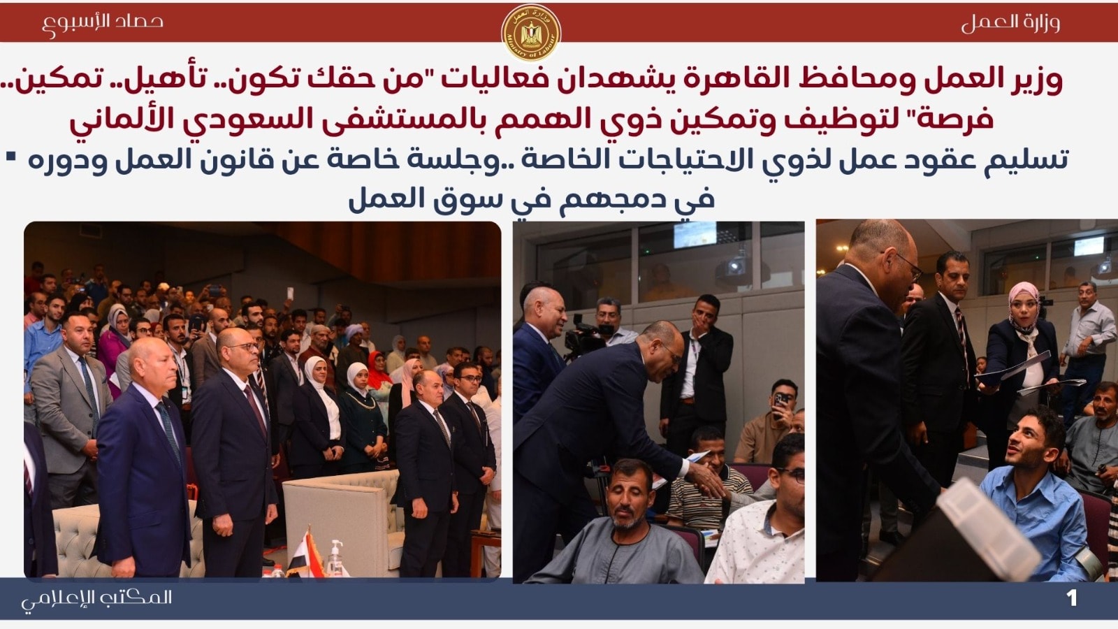 بهذه الجهود المتكاملة، واصلت وزارة العمل خلال الأسبوع تنفيذ رؤية الدولة لبناء سوق عمل منظم، آمن، وعادل، قائم على الشراكة بين الحكومة والقطاع الخاص والمجتمع المدني، بما يعزز التنمية المستدامة وينشر ثقافة السلامة والصحة المهنية في مواقع العمل ،ويصون كرامة الإنسان العامل في الجمهورية الجديدة.