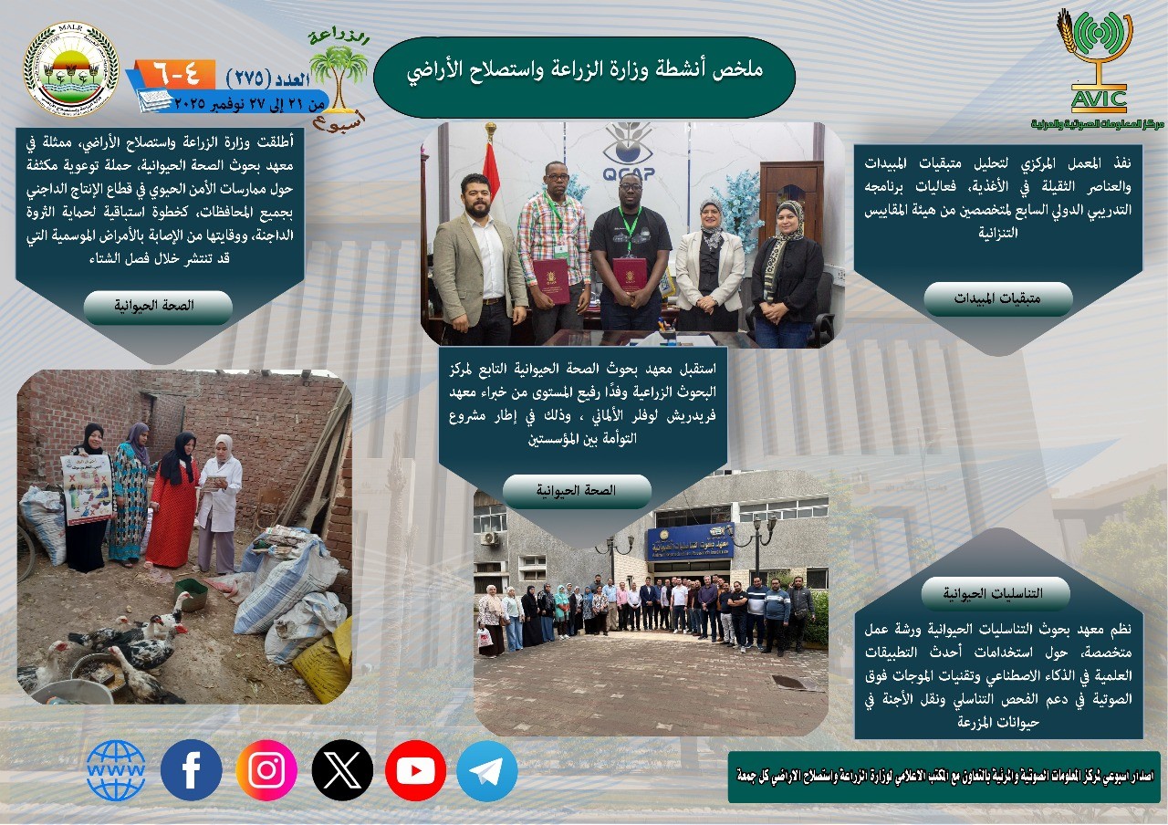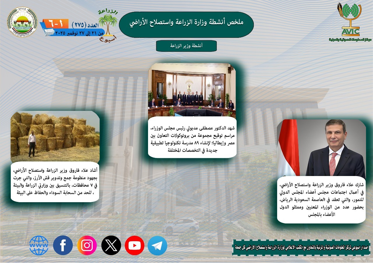“الزراعة في اسبوع” نشرة الحصاد رقم 275 لأنشطة الوزارة في الفترة من 21 وحتى 27 نوفمبر الجاري – الأخبار