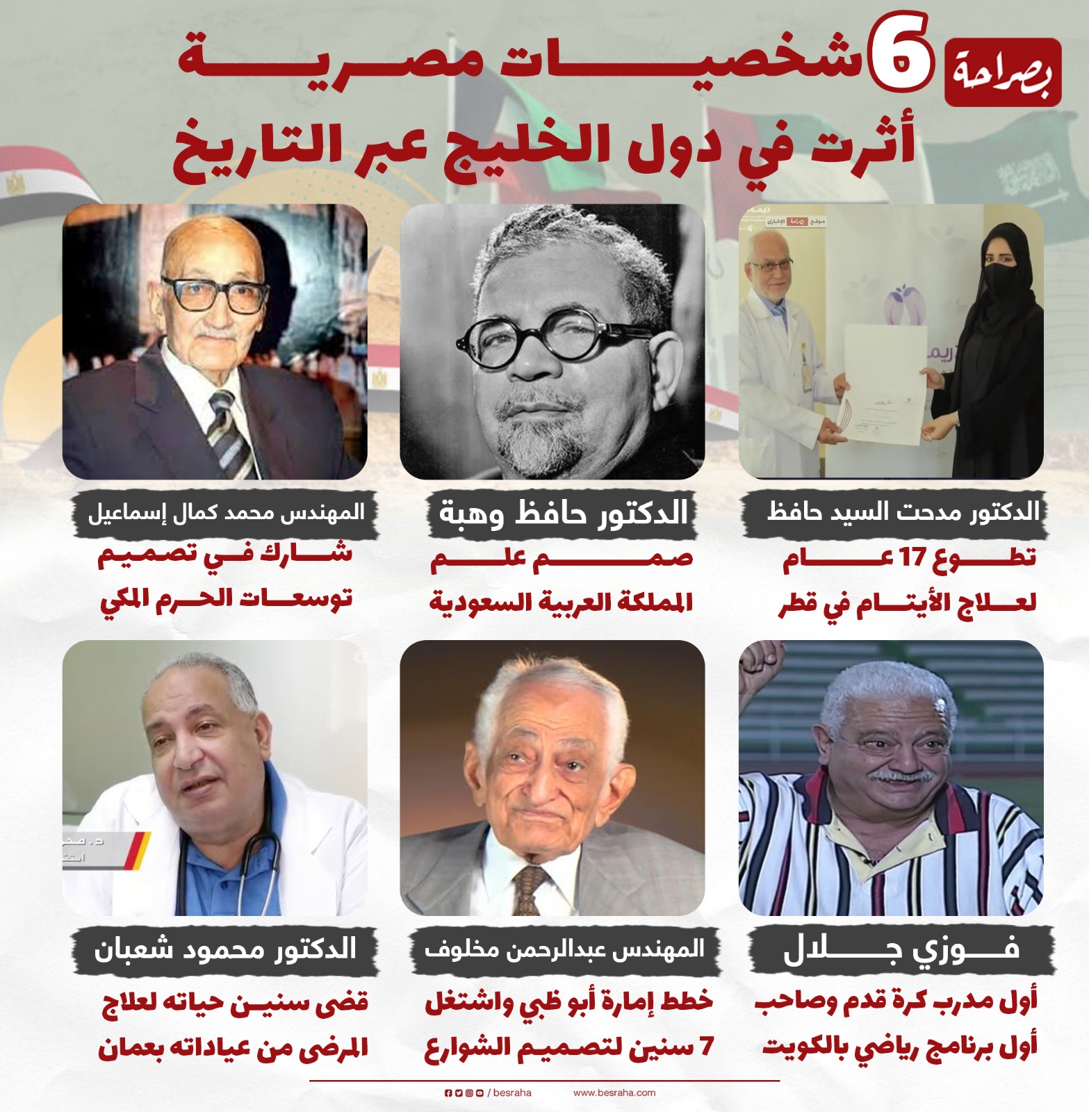 ومن خلال هذا التقرير يستعرض لكم موقع “بصراحة” أبرز مساهمات ست شخصيات مصرية مؤثرة عبر التاريخ، قدمت زهرة شبابها وعبقريتها لدعم التطور في دول الخليج الشقيقة: