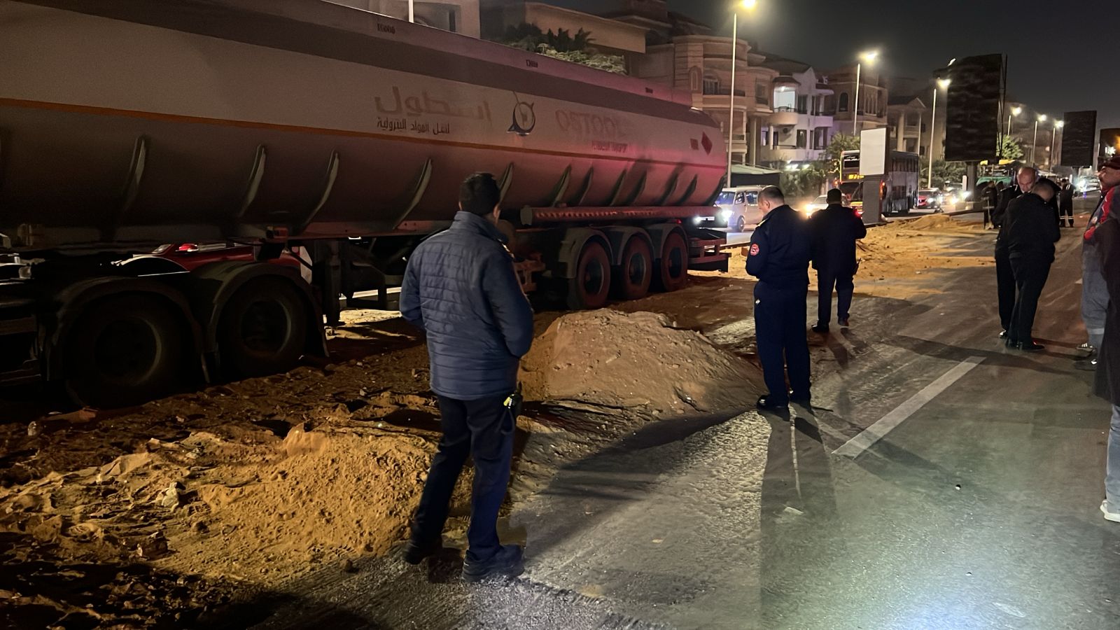 كما أظهرت عمليات الفحص، عن وجود تسريب بنزین بنهر الطريق علي مساحه 2 متر × 100 متر حيث إن الكمية المفقودة من الخزان 1000 لتر وقام القوات بتأمين التسريب بعدد (2) سيارة إطفاء عن طريق عزل الماده البترولية وتم اتخاذ الإجراءات القانونية اللازمة تجاه الواقعة.