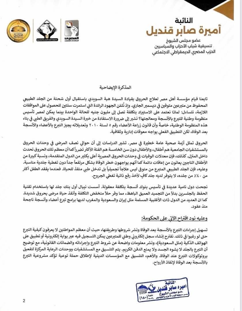 وأوضحت المذكرة أن قانون زراعة الأعضاء رقم 5 لسنة 2010 وتعديلاته يجيز التبرع بالأعضاء والأنسجة بعد الوفاة، إلا أن التطبيق الفعلي يواجه معوقات إدارية وثقافية، مشيرة إلى أن الحروق تمثل أزمة صحية عامة خطيرة في مصر، وأن حوالي نصف المرضى في وحدات الحروق بالمستشفيات الجامعية هم أطفال، كما أن الأطفال دون سن الخامسة هم الأكثر تضرراً، وأن معدلات الوفيات في وحدات الحروق أعلى بكثير مقارنة بالدول المتقدمة، مع معاناة نسبة كبيرة من الناجين من إعاقات دائمة وخطر الوفاة بسبب نقص الجلد المتاح.