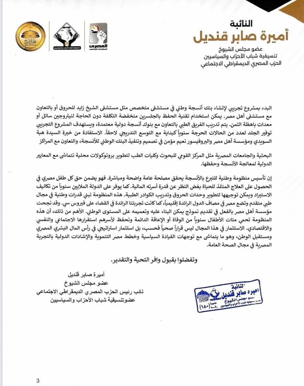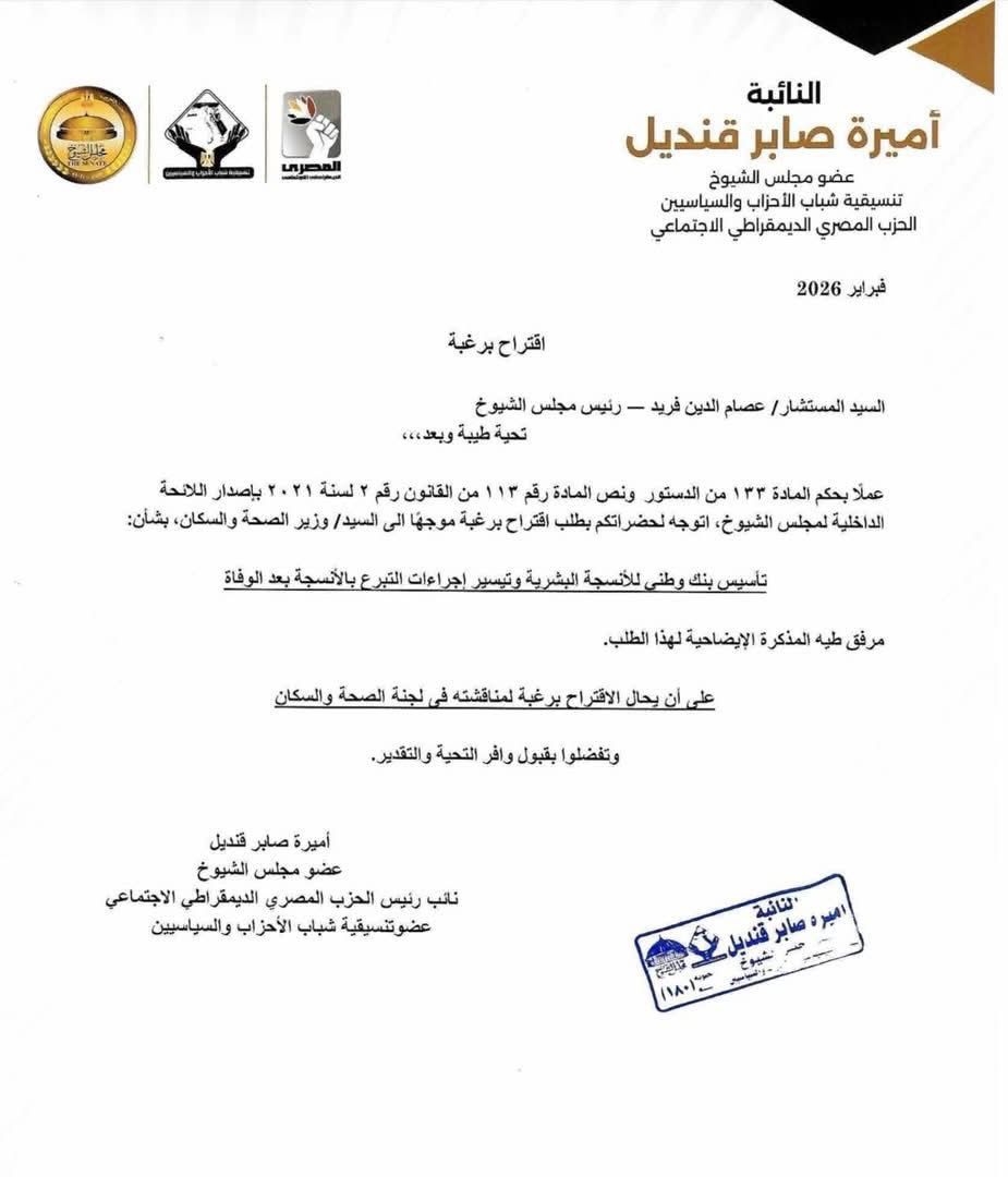 وأشارت قنديل في المذكرة الإيضاحية إلى قيام مؤسسة أهل مصر لعلاج الحروق بقيادة السيدة هبة السويدي باستقبال أول شحنة من الجلد الطبيعي المحفوظ من متبرعين متوفين في ديسمبر الجاري، مؤكدة على ضرورة الاستفادة من هذه الخبرات لبناء منظومة وطنية للتبرع بالأنسجة ومعالجتها، بدلاً من الاعتماد على الاستيراد بتكلفة تصل إلى مليون جنيه لكل حالة.