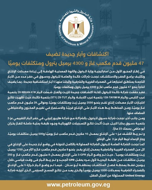 في إطار المحور الأول من استراتيجية وزارة البترول والثروة المعدنية الهادفة إلى زيادة معدلات الإنتاج وتكثيف برامج الحفر والاستكشاف، نجحت شركات خالدة والعامة للبترول ودسوق في حفر عدد من الآبار الناجحة بمناطق امتيازها في الصحراء الغربية والشرقية والدلتا منها 5 آبار استكشافية جديدة ، بما يضيف انتاجاً بنحو 47 مليون قدم مكعب غاز و 4300 برميل بترول ومكثفات يوميًا.