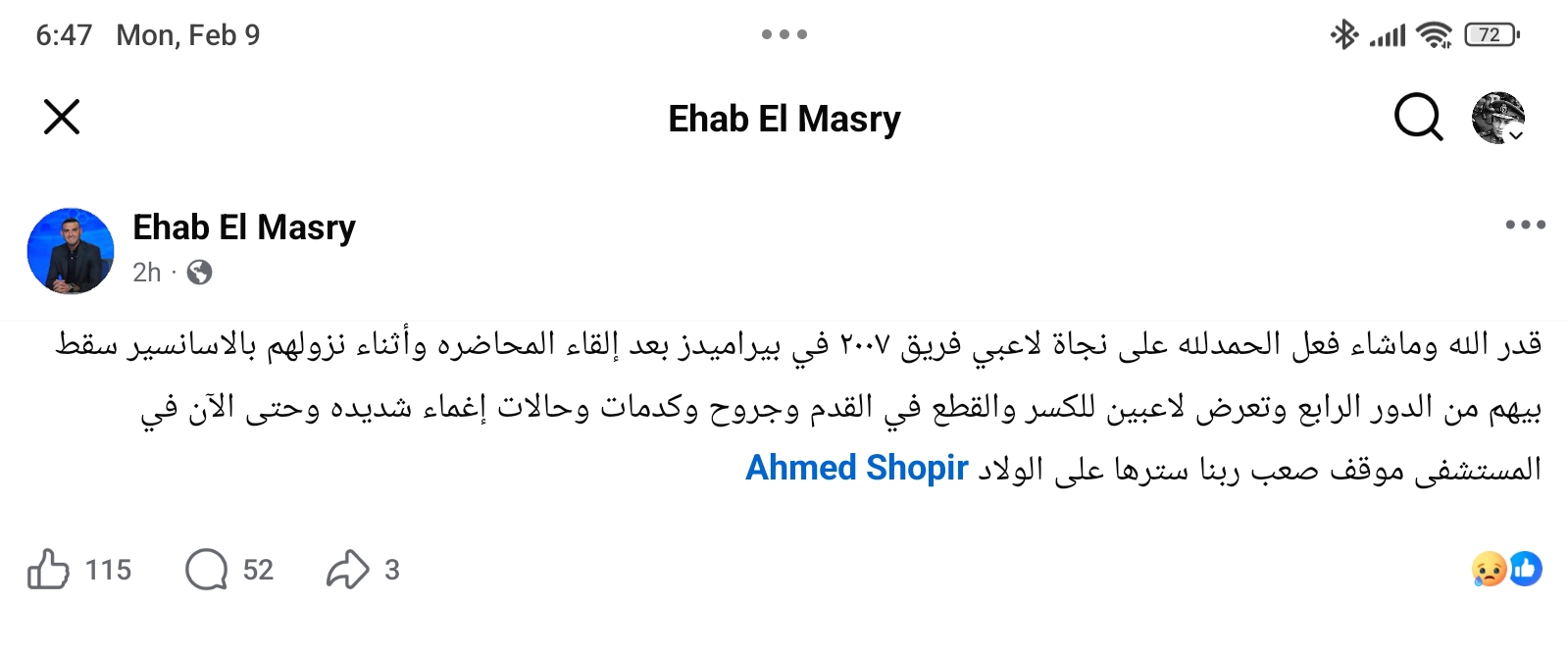 وكتب المصري عبر حسابه الرسمي على فيسبوك: «قدر الله وما شاء فعل، الحمد لله على نجاة لاعبي فريق 2007 في بيراميدز بعد إلقاء المحاضرة وأثناء نزولهم بالأسانسير سقط بيهم من الدور الرابع».