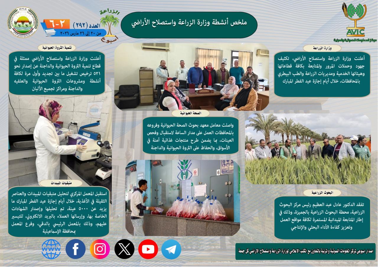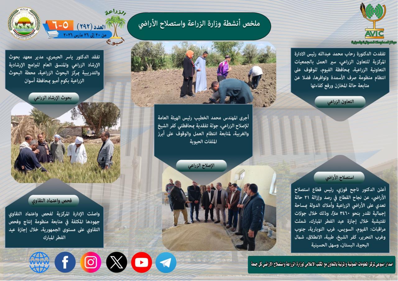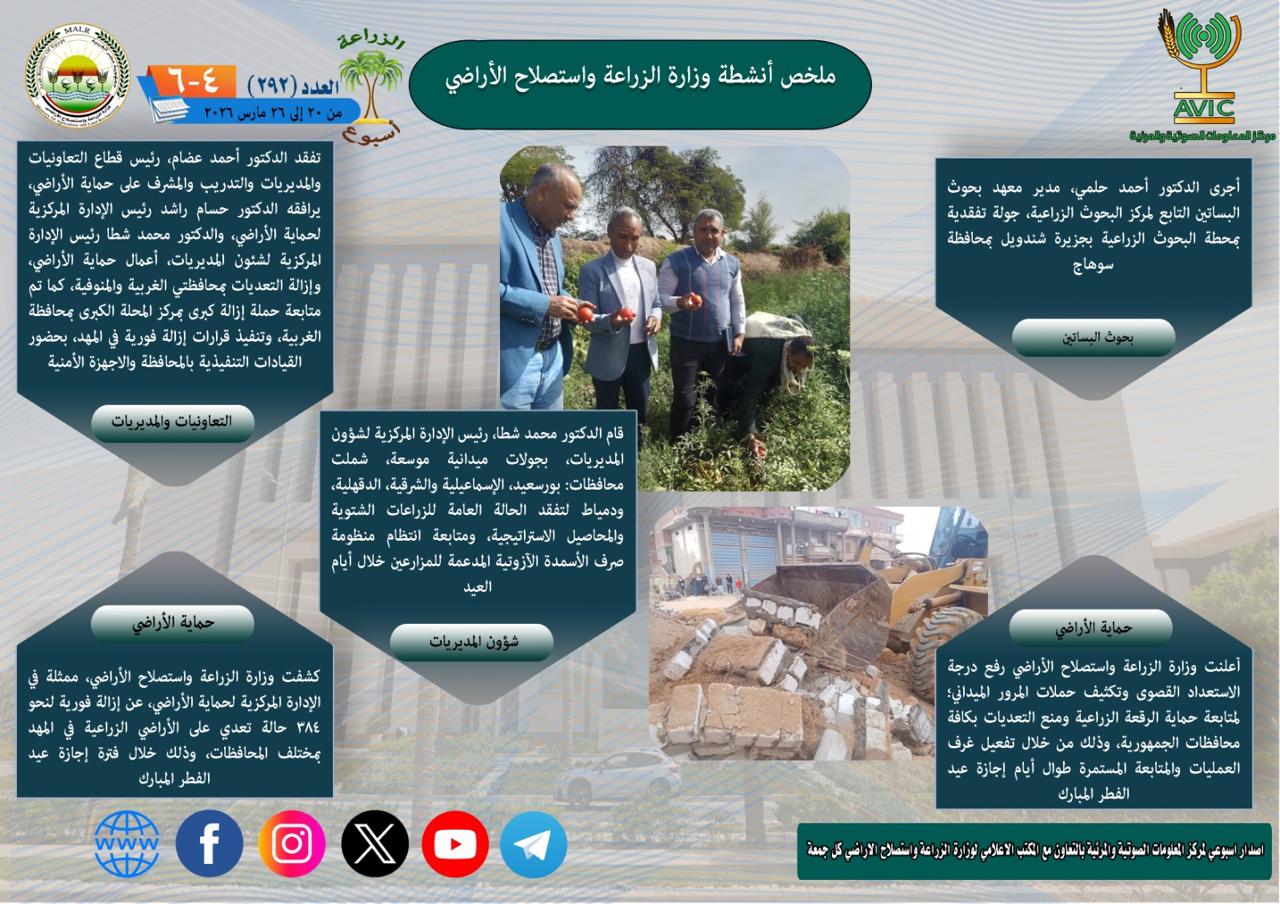 أصدر مركز المعلومات الصوتية والمرئية بوزارة الزراعة واستصلاح الأراضي، “الانفوجراف الأسبوعي” في نسخته رقم 292 حول الحصاد الأسبوعي لأهم أنشطة الوزارة خلال الفترة من 20 وحتى 26 مارس الجاري، كما أصدر المركز ملخصًا بالفيديو يغطي نفس الفترة.