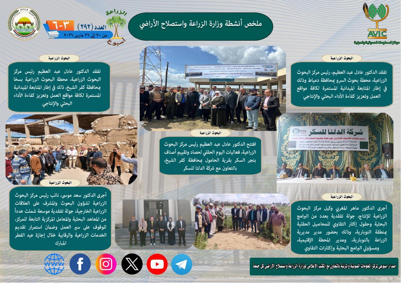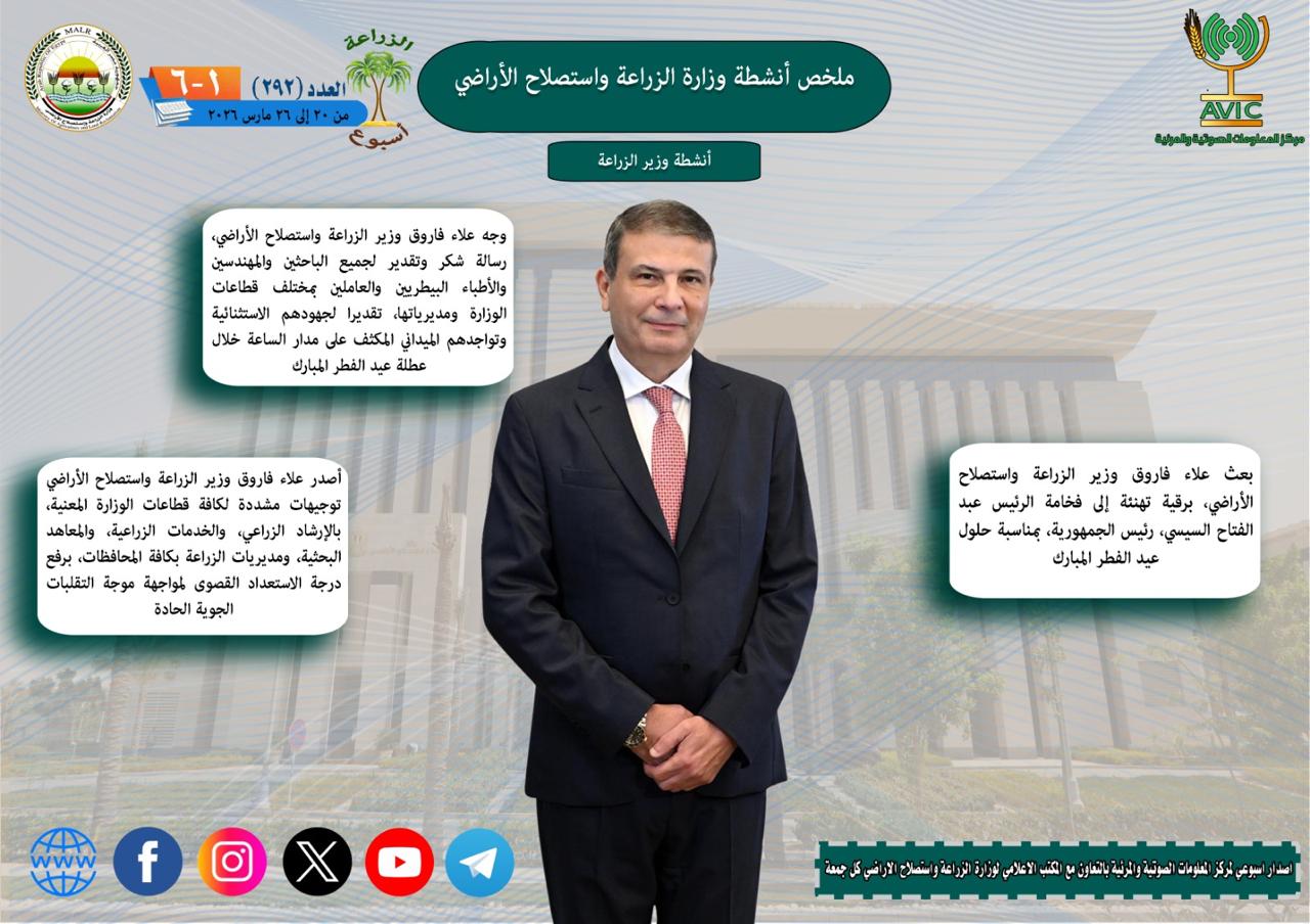 يذكر ان مركز المعلومات الصوتية والمرئية، والمكتب الإعلامي للوزارة، يصدران الجمعة من كل أسبوع، انفوجرافا وفيديو باسم: الزراعة في أسبوع، لإلقاء الضوء على ملخص ما تم من أنشطة وجهود، بكافة القطاعات والهيئات، التابعة للوزارة.