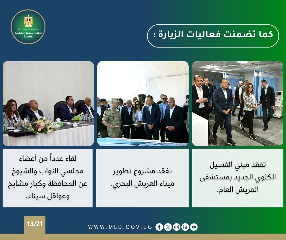وتضمنت الأنشطة متابعة تنفيذ المشروعات التنموية على أرض المحافظات، مع التأكيد على إزالة المعوقات وتسريع معدلات التنفيذ، بما يحقق تحسين جودة الحياة للمواطنين ودعم خطط التنمية المحلية.