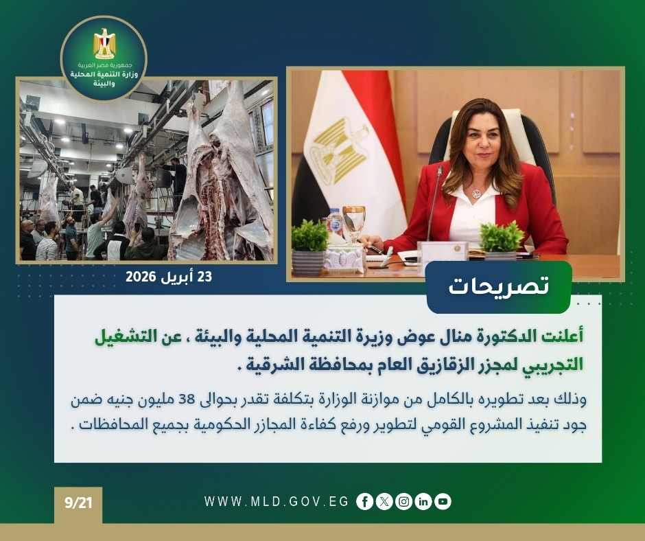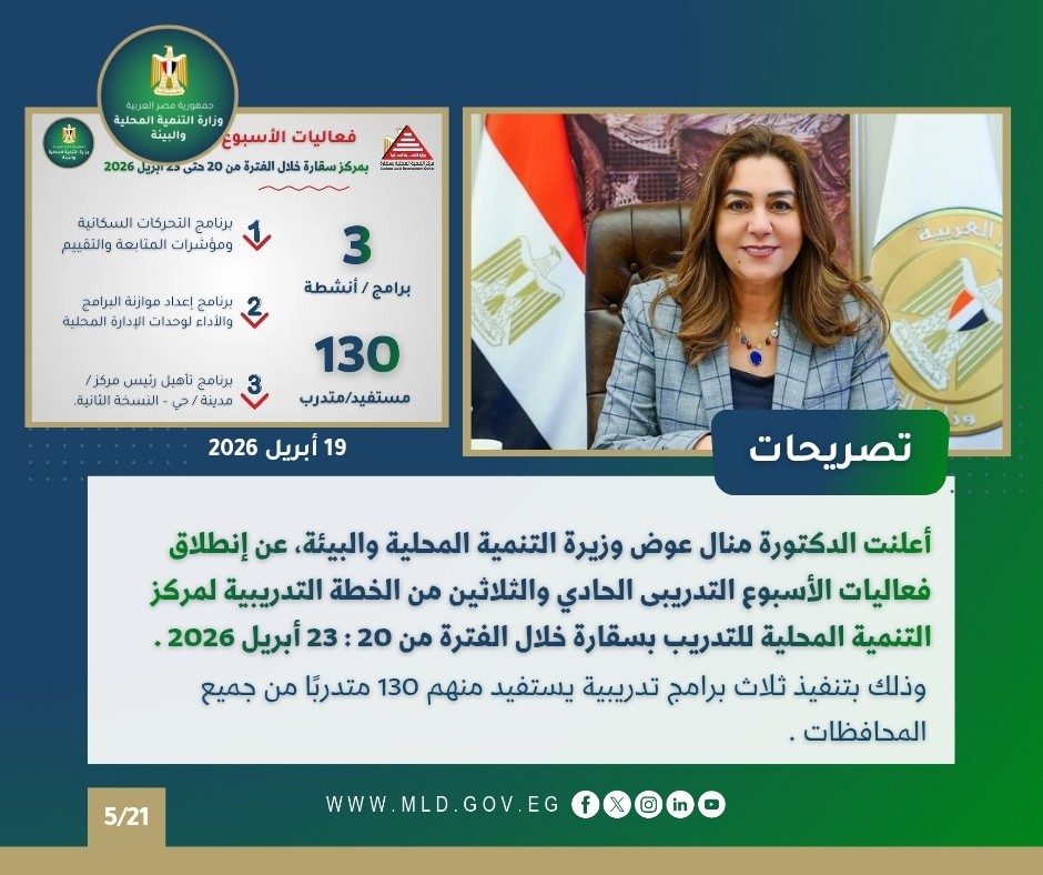 أصدر المركز الإعلامي لوزارة التنمية المحلية والبيئة “الإنفوجراف الأسبوعي” في نسخته الـ185، والذي يستعرض أبرز أنشطة وفعاليات الوزارة بقيادة الدكتورة منال عوض، وزيرة التنمية المحلية والبيئة، خلال الفترة من 17 إلى 23 أبريل 2026، متضمنًا مجموعة من الاجتماعات والفعاليات ومتابعة المشروعات التنموية على مستوى الجمهورية.